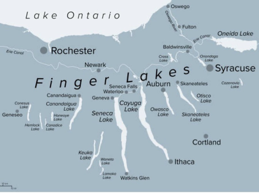 Finger Lakes is the oldest and most attractive wine district of New York State, lying close to the border with Canada. The name comes from the narrow, deep lakes that look like the fingers of a hand. The unusual formation was carved by Ice Age glaciers which deposited shallow topsoil on shale beds above the lakes.